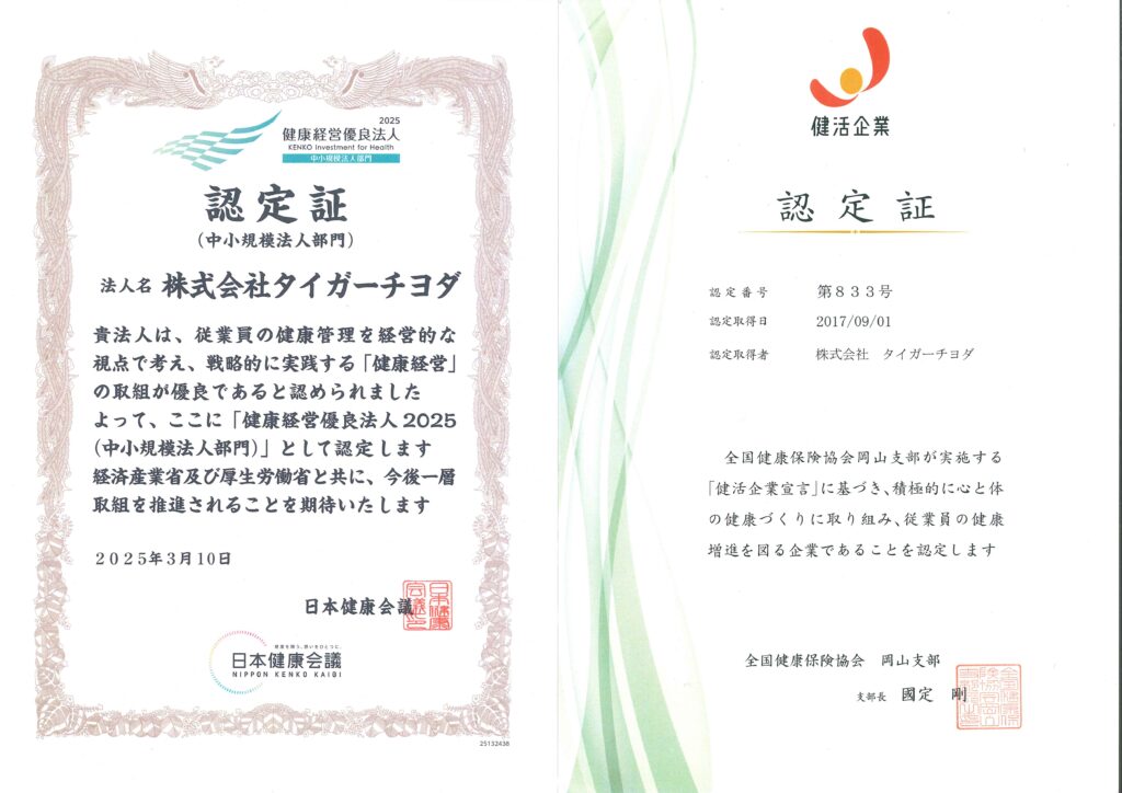 この度、株式会社タイガーチヨダは、経済産業省と日本健康会議が共同で選定する「健康経営優良法人2025(中小規模法人部門)」に認定されましたことをご報告いたします。